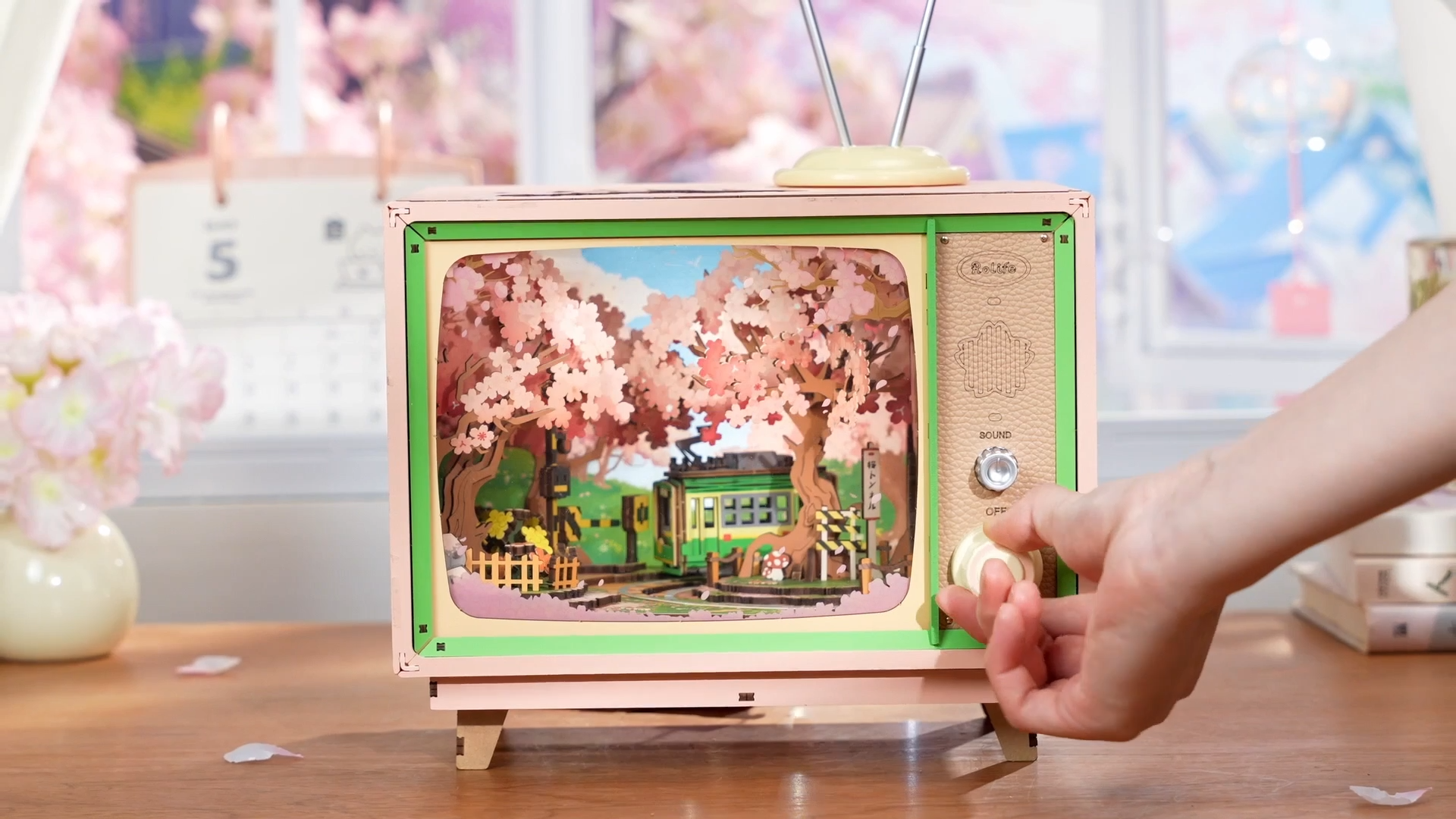 Rolife blesses your days with peace and serenity through the sights and sounds of the Sakura Dreamy Tour. Peer into the pastel-colored television set and be captivated by the gentle movement of a green Japanese train car on its springtime journey. In the background, you’ll find abundant pink cherry blossoms, the warm glow of amber lights, a clear blue sky, and the trill of soft music. Hum along to the graceful notes of Minuet in G Major or the uplifting melody of Jesu, Joy of Man’s Desiring. The old-school TV set frames the scene and gives off retro vibes with its cube shape, rabbit-ear antenna, and turning knob that adjusts the lights and music.