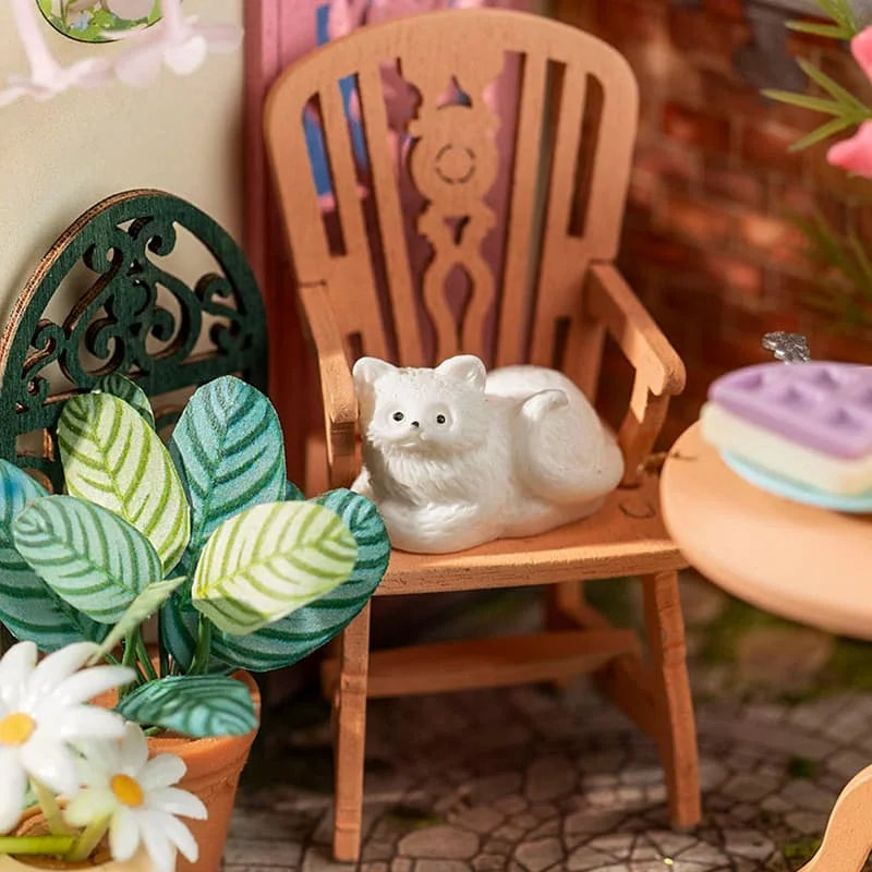 Have a slice of idyllic life at the Fancy Tea Yard. This set from Rolife’s Little & Warm Space series displays the simple pleasures of enjoying tea and dessert while outdoors soaking in the sun’s warmth. The fresh air and quiet moments surrounded by nature are precious and comforting, granting you a reprieve from life’s fast pace. Your peaceful afternoon tea consists of a balanced, aromatic brew served on a delicate tea set, and your menu selection includes classic waffles, Biscoff cake, butter cookies, fresh fruit, plus more. Potted plants and a birdhouse adorn the space, while you sit comfortably on a wrought iron-inspired chair set atop mosaic pavers. Whether as a personal project or a thoughtful gift, this miniature scene promises an enjoyable journey.