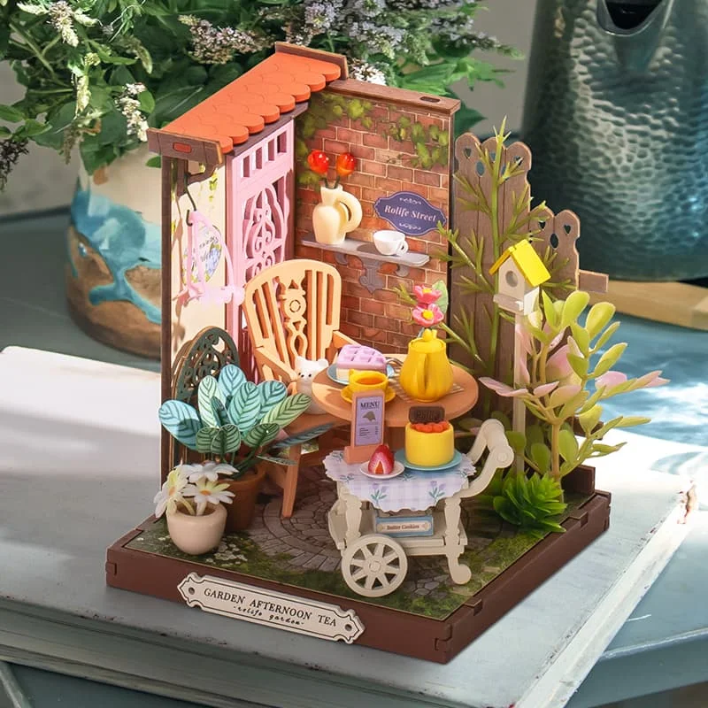 The designers at Rolife encourage everyone to enjoy crafting not just as a hobby but as a special interactive experience. This is because building miniature houses like this model from the Little & Warm Space series provides many benefits including relaxation, stress relief, and an outlet for creativity. We want to ensure that each model is worth your time and effort for its beauty, mood, and amount of challenge. We also make sure to come up with thoughtful themes each with its distinct character to tell a story. We do this by paying close attention to every meticulous detail, like the visible veins of the plant leaves, the ribbing on the teapot, or the door patterns in the Fancy Tea Yard. We also use sturdy materials including laser-cut wood and paper to help you preserve your hard work. This is our commitment to quality and fine craftsmanship.