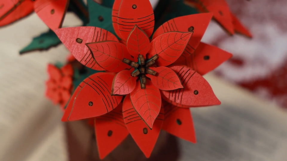 The beloved holiday flower is here to stay! This Christmas flower decor beckons the festive spirit with its velvety leaves that stay red all year long. A delightful home, office, or desk decoration and perfect Christmas gift from the Wooden Bloom Craft Series, this 153-piece puzzle is ideal even for beginners looking for a worthwhile, creative holiday project. The realism is heartwarming with this wooden poinsettia model's textured bracts, smooth edges, and pointed tips. The arrangement is set on a brown pot stylized with etched floral patterns for extra detail. The stems are flexible and adjustable so you can personalize the Poinsettia Christmas ornament, and the base of the pot can be removed if you want to reduce the puzzle's height. If you prefer this DIY kit as a gift, greeting cards are included in the box, so you can send your heartfelt messages to your beloved recipients.